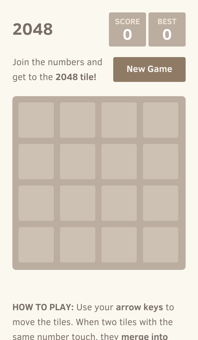 New GameHow to play: Use your arrow keys or swipe to move the tiles. When two tiles with the same image touch, they merge into one!